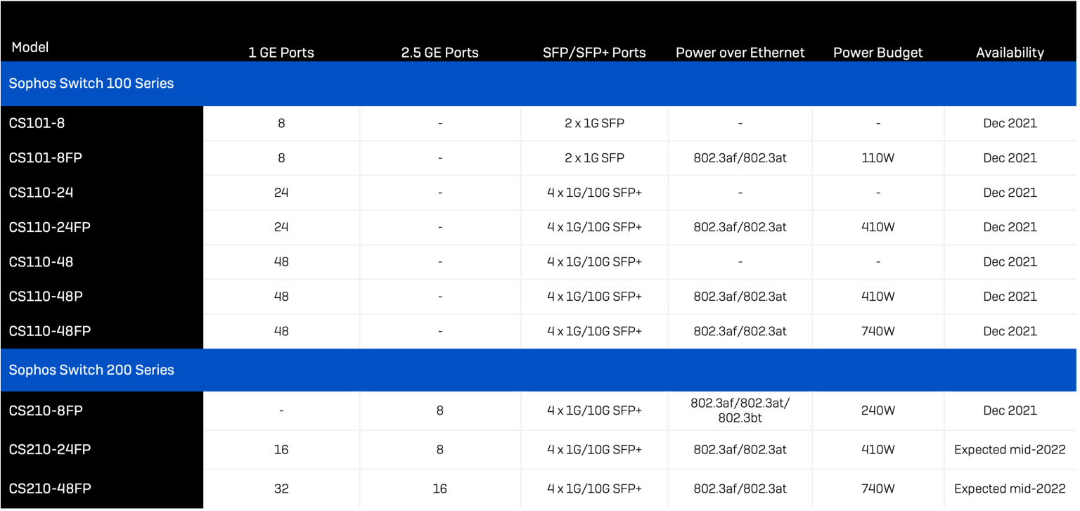 Sophos proposera dans un premier temps huit modèles, deux autres étant attendus pour la mi-2022. Tous les commutateurs pourront être administrés dans Sophos Central en même temps que vos autres produits Sophos. Cependant, dès la première version, l'ensemble des fonctionnalités et la configuration ne seront disponibles que via l'interface web locale. L'administration est également prise en charge via l'interface de ligne de commande (CLI) ou le protocole SNMP (Simple Networking Management Protocol).